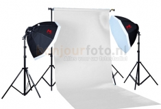 Deze set bestaat uit twee krachtige daglichtlampen en een achtergrondset met witte papierrol. De set is zeer geschikt voor het fotograferen van personen en paspoppen, maar ook voorwerpen zoals tassen, koffers, kleding, meubels etc. Deze achtergrond bestaat uit een achtergrond ophangsysteem en een papierrol van 1,38m breed en 11m lang. Het papier is helderwit en bij de juiste camera instellingen staat het product geheel "vrij". Het papier is goed van dikte, scheurt niet zo snel en is 100% effen en egaal. Voor webshop fotografie is het belangrijk een 100% egale achtergrond te hebben. Papier is hiervoor veruit de beste oplossing. Als het vies wordt, knipt u het af. Door de lengte (11 meter!) heeft u niet snel een nieuwe rol nodig. En als dat toch nodig is, is vervangen niet duur. Het achtergrondsysteem bestaat uit twee statieven (max. hoogte 250 cm), twee rolhouders, twee beugels, een ketting en een gewichtje voor de ketting. U plaatst de rolhouders links en rechts in de achtergrondrol. De harde kartonnen kern van de rol fungeert dan dus als dwarsligger. Met de ketting kunt u de rol heel precies op- en afrollen en vastzetten. Op dit systeem passen behalve de meegeleverde witte rol, uiteraard ook papierrollen in een andere kleur of breedte (zoals de 2,75m brede rollen). De verlichtingDeze veelzijdige daglicht lampenset biedt u twee lamphouders met in elk vier spiraallampen (spaarlampen) van 55W. Dit is grofweg vergelijkbaar met 220W normaal licht, wat betekent dat iedere lampunit bijna 1000W aan licht afgeeft! De set wordt geleverd met twee octaboxen (achthoekige softboxen) met een diameter van 70 cm. Deze softboxen maken het licht diffuus en zorgen voor een mooie, natuurlijke spreiding. Ook worden twee stevige statieven meegeleverd die een maximale hoogte van 240 cm kunnen bereiken. De 4 lampen per unit zijn in paren in- en uitschakelbaar. Dit betekent dat u een unit dus op 50% en op 100% vermogen kan zetten. De kleurtemperatuur is "koud licht", oftewel neutraal wit daglicht. Dit is optimaal voor foto- en videobewerking. Deze set is universeel inzetbaar, bijvoorbeeld voor productfotografie en portretfotografie. De spiraallampen worden nauwelijks warm, daardoor heeft de set geen motorkoeling. Dat maakt deze set dus bijzonder geschikt voor video. TipsDe opbouw spreekt voor zich, maar soms is het handig om een duidelijke foto-handleiding te hebben. Je vindt hem hier: Levering